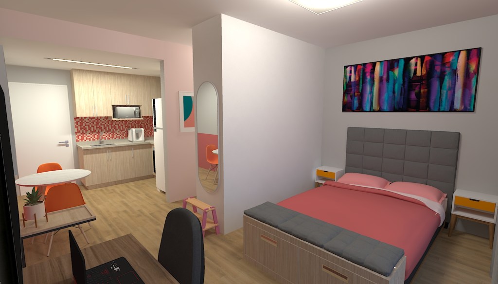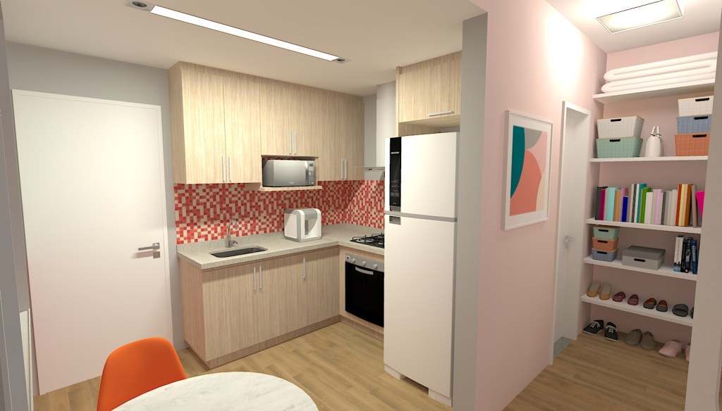 Nesse Studio o armário é disposto de maneira a criar uma divisória para o quarto, delimitando um corredor que leva para o banheiro. Na parede final deste corredor, preferi utilizar prateleiras para aproveitar a parede tanto para armazenamento, quanto para exibir itens de forma decorativa.