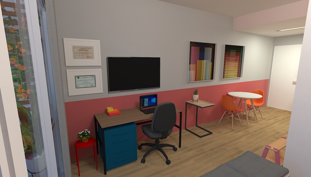 Este é um projeto simples, com predominância de móveis soltos e pouca marcenaria, tudo pensado para atender as necessidades da cliente.